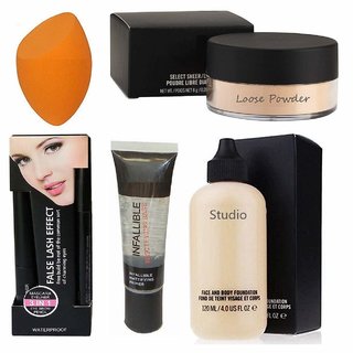 Know More7 combo of 3 in 1 liner, mascara, eyebrowpencil, infallible, studio face & body foundation, loose powder, blender puff A Must have Combo for every Women in their make-up Kit 100% Brand New Products Every Product Is Skin Friendly Perfect For Professional parlor, Wedding, Party And Home Use.