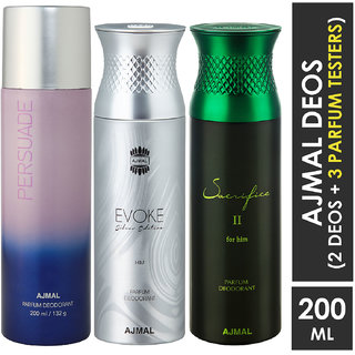 Ajmal 1 Persuade , 1 Evoke Silver Edition And 1 Sacrifice Ii Deodorants For Unisex Each 200Ml Pack Of 3+2 Parfum Testers (3 Items In The Set) Deodrants for men, women deodrants online, Body deodrants online, Online ladies deodrants, top deodrants for men, mini deodrants online, best mens deodrants, Deodrants & perfumes online, Best Deodrants (Deos) for Men & Women Online, Deodrants & roll on fo Ajmal Product Id : 152145092