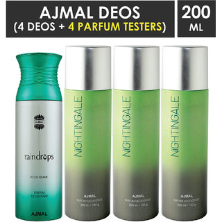 • Ajmal 1 Raindrops Femme For Women And 3 Nightingale For Men & Women High Quality Deodorants Each 200Ml Combo Pack Of 4 (Total 800Ml) 2 Parfum Testers Perfume Body Spray - For Men & Women (800 Ml, Pack Of 4)