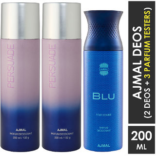 • Ajmal 2 Persuade For Men & Women And 1 Blu Homme For Men High Quality Deodorants Each 200Ml Combo Pack Of 3 (Total 600Ml) 2 Parfum Testers Perfume Body Spray - For Men & Women (600 Ml, Pack Of 3)