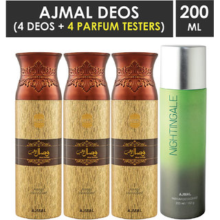 Ajmal 3 Wisal Dhahab And 1 Nightingale Deodorants Each 200Ml Pack Of 4+2 Parfum Testers (4 Items In The Set)
