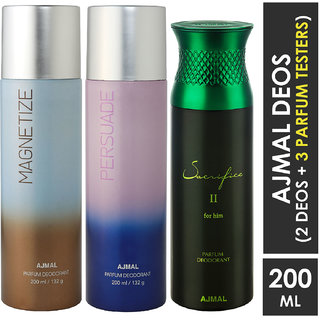 Ajmal Magnetize And Persuade For Men & Women And Sacrifice Ii For Him For Men High Quality Deodorants Each 200Ml Combo Pack Of 3 (Total 600Ml) 2 Parfum Testers Perfume Body Spray - For Men & Women (600 Ml, Pack Of 3)