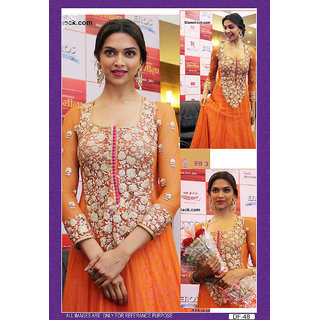 Deepika padukone in designer deep orange anarkali suit. With work of bead, resham, moti, antique zardosi and diamonds. It's top salwar length 48 inch, with jacquard  / bottom and chiffon dupatta. It can stitched upto size 42. sleeves is in chiffon fabric and it can be stitched upto 22 inch. (Slight color variation is Possible.) (It's a replicate product & It is 90% same product. Images are only for reference purpose. Real Images are provide on request.)