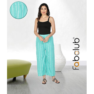 Know MoreStriped printed turquoise palazzo pant from fabclub is made from heavy 14kg rayon soft fabric. It features free size, mid rise, 38 Inches ankle Length. Free size palazzo pant has stretchable elasticated waist band, perfect fits for waist size 28 Inches to 42 Inches and length 38 Inches . This palazzo can be matched with kurtis for ethnic look or else tee / top for a fusion and indo-western look. This regular fit casual wear ethnic bottom will keep you comfortable all day long and gives classy look.