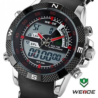 Brand new weide watch wh-1104R-4 men boys analogue quartz red pointers digital electronic dual time Japan movement watch alarm chronograph water resistant wr30m function stainless steel back case black rubber strap band men wrist watch