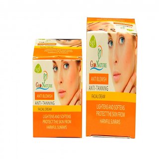 Geonature Anti-Blemish Anti-Tanning cream Lighten and softens protect the skin from harmful sunrays. It repair the damage done by the harmful UV sun rays. It lightens blemish, removes dead cells and leaves your skin clear radiant. Effective herbs calm down irritated cells and form a protective layer that prevents further damage by UV rays.