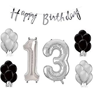 Know MoreA Pack includes 1 Happy Birthday Banner Silver cursive + 13 Digit Foil Balloon (16 inches) + Balck N Silver Metallic Balloons 30 pcs(15 each) . A total party solution in one pack.