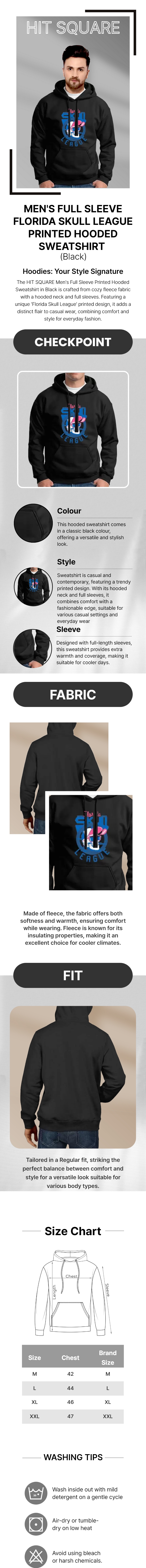 Hoodies: Your Style Signature The HIT SQUARE Men's Full Sleeve Printed Hooded Sweatshirt in Black is crafted from cozy fleece fabric with a hooded neck and full sleeves. Featuring a unique 'Florida League' printed design, it adds a distinct flair to casual wear, combining comfort and style for everyday fashion.
