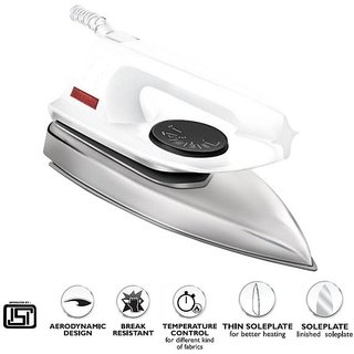 Know MoreDesign This Indigo Iron sports a super clean surface finished with pleasing aesthetics. The iron has a comfortable hand grip for a relaxed ironing session. Features The Indigo Dry Iron is equipped with a cool touch body. The cool touch body keeps you safe from accidental burns by keeping the body of the iron cool during the ironing session. The Bajaj iron comes with a non-stick coated black color soleplate. This soleplate ensures easy ironing and prevents fabrics from sticking to the iron due to overheating. Power & Safety This dry iron from Indigo consumes 750 W of power for quick heating. For additional safety, the iron comes with a thermal fuse which helps disconnect the power during overload and prevent short circuits. Color can be change as stock is available.