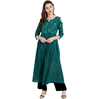 Know MoreThis stylish kurta from janasya is made of cotton and comes in an attractive green color. It features 3/4th sleeve , flared ,v-neck and it is long kurta that is suitable for casual occasions. Team it with matching leggings for a chic look.