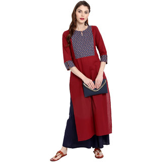 Know MoreThis stylish kurta from janasya is made of cotton and comes in an attractive maroon color. It features 3/4th sleeve , straight ,keyhole neck and it is calf long kurta that is suitable for casual occasions. Team it with matching leggings for a chic look.
