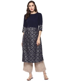 Know MoreJanasya Navy Blue Embellished 3/4 Sleeves Straight Crepe Kurti