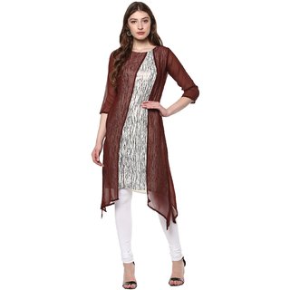 Know MoreThis stylish foil print kurta from janasya is made of crepe and comes in an attractive off white color. It features 3/4th sleeve ,asymmetric, round neck and it is medium length kurta that is suitable for festive occasions. Team it with matching leggings for a chic look.