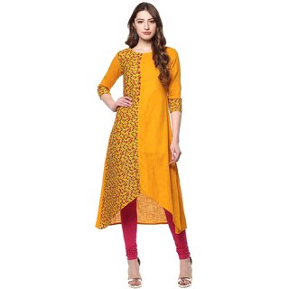 Know MoreThis stylish kurta from janasya is made of cotton and comes in an attractive yellow color. It features 3/4th sleeve ,high low hemline, round neck and it is calf length kurta that is suitable for festive occasions. Team it with matching leggings for a chic look.