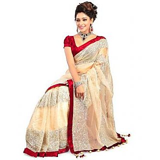 Know Moreparty wear saree in cream colour and also with rad border with branded material this product mad by our compny with garented material ,our compny aim is to provide survice to customer is vrryy very good ,we give satisfaction to our coustome r by providing required qulity of material its very good looking saree in party wear,
