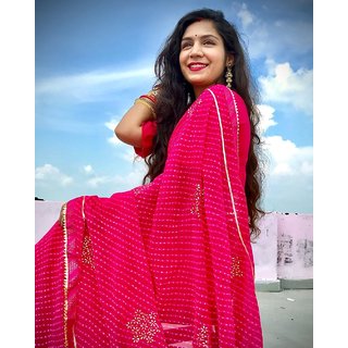 Know MoreBeautiful georgette leheriya saree is what you require for this summer season! This leheriya saree is crafted in Kota silk, which has a characteristic sheen and lightweight feel. This leheriya saree is crafted in Kota silk, which has a characteristic sheen and lightweight feel. Made with the traditional style of the tie-dye technique in Rajasthan, the Leheriya is a unique, brightly coloured saree with distinctive patterns. The word Leheriya means wave. The name of this saree is taken from Rajasthani word because of its beautiful and complex wave patterns.