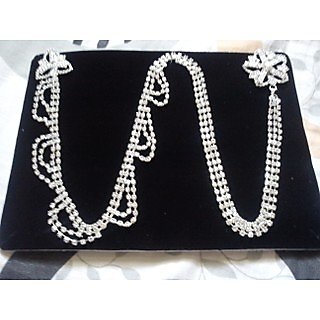 Know MoreThe Long chain saree brooch is very popular in demand in latest fashion because it provides heavy shiner look. It enhances your appearance simply adding an accessory in your collection. This long chain brooch has beautiful design on two brooches connected with 3 layer long chain which has beautiful design. You can also separate all the brooches and chain to use the brooch only as brooch pin. The brooch is available in shiny stones with silver tone.