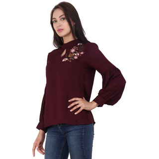 Know MoreThis Solid bubble crepe top from Aesmarize, has a Mandarin neck, full sleeves, floral embroidered detail
