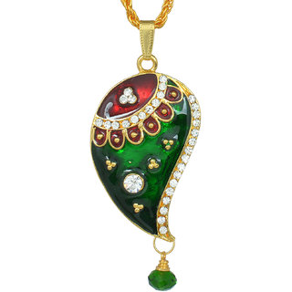 Know MoreShow your love, with this Green Meena and Kundan and White CZ studded Kairi Mango Pendant. It is also added with a drop hanging, adding to its beauty. Its an all season, all occasion, all jewellery pendant, which goes with all dresses as well. A good self use pendant, it is also an ideal gifting option to someone close to your heart. Look elegant, stylish, and draw attention and appreciation,towards your side, in any party or gathering.