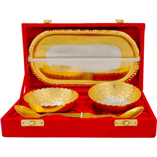 | Common or Generic Name | Nau NidhBrass Bowl Set of 2 Silver Coating Inside and Golden COATIONG Outside with Two Spoon and Tray Set |