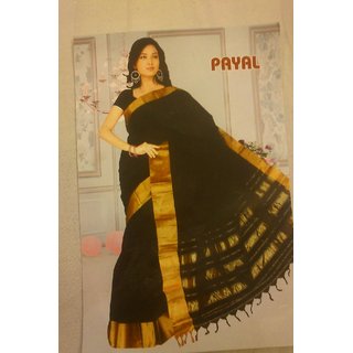 Know MorePayal Black and Gold Colour Handloom Cotton Saree with golden zare border
