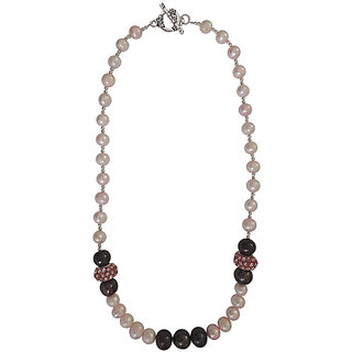 | Description: | This charming necklace is made with Freshwater Pearl adorn with silver tone metal beads and CZ metal rings. The strand is secured with a metal round ring "T" clasp |