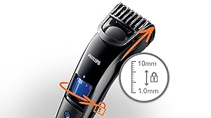 Easy to use – get a 3-day shadow look of 1mm or a full beard of 10mm, in precise 1mm steps by simply turning the wheel to select and lock-in the length settings you want or remove the comb and get the zero trim look of 0.5mm.