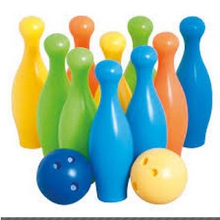 This 10-Pin Mini Bowling Set by Ekta has 10 colorful bowling pins and two authentic looking bowling balls. The balls have finger holes ideally suited for small hands. This set is fun for both indoor and outdoor play. An action packed game, contains the