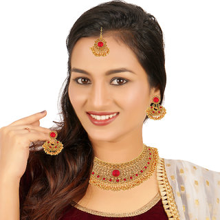 Know More| This is gold plated jewellery set with a necklace and a pair of earrings with mangtikka. A good finish and pretty colour combination with a pair of matching earrings. This necklace set will enhance your beauty , you can wear it with any ethnic wear of your choice to look best.These choker jewelry sets are suitable for women and girls. |