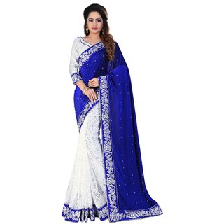 Know MoreSaadhvi Blue and White Velvet and Brasso Embroidered Saree With Blouse