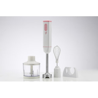 ERGONOMIC DESIGN: This sleek and elegant immersion blender has a slim and ergonomic handle with breakage resistant power cord and an effective 600W DC motor. It has 2 speed switches, strong, durable SS blade and anti-splash guard to prevent food splatter. This BPA free set is available in pink and white color, including a hang-up loop for easy mounting.