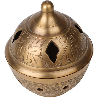 Know More| Our ancient incense holder provides you with ceremonial tools reminiscent of a bygone age. Place charcoal embers and powdered resin in the fumer, streaming fragrant smoke around the house. Use as a daily ritual at dawn and dusk for its distinguished fragrance and healing properties. Pure Brass Sheet base with antique brass finish, intricately decorated with hand beaten dimples with jali that decorate its surface and a patterned cut out on the top allowing fumes to escape. Designed to hold burning charcoal and powdered resins, dispersing aromas through holes in its surface. |
