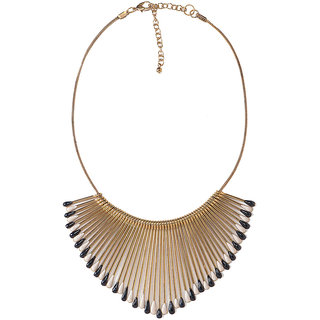 Know MoreThis spectacular bib necklace is a cavalcade of metal pipes with tumbling spikes in golden and black tones- a striking balance of edgy and elegance that adds maximum chic to any look.