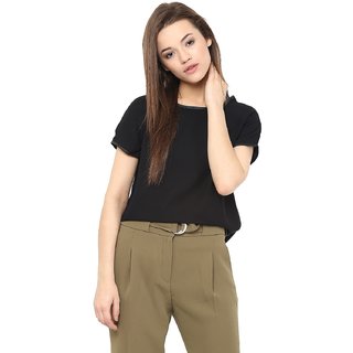 An excellent addition to your wardrobe is this black crepe top. The leather trims on the neckline, hemline, cuffs and torso sides, make this top a true value for money. Team it with classic trousers and pumps along with a laptop bag to perfect your look.