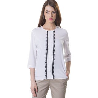 Know MoreMirrored lace on the front brings a radiant character to this lighweight subtly colored poly crepe top. With its three quarter sleeves and a sophisticated fit, this classic piece will certainly add a new charm to your work look.