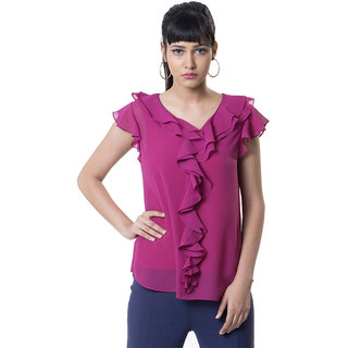 Know MoreMeet our ultra-flattering frill wave top which makes every body look beautiful. In this lusciously soft, richely colored georgette, textual contrasts make a fabulous statement with the bold singular frill around the neck and arms.
