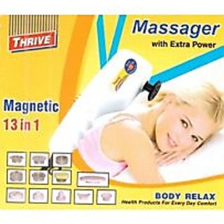 It is high electric powered massager with 2 speedsIt features Facial care, Hair, Whole body, Scalp,Back,Arms & Legs, massage, Accupressure,Aching Feet, Oil MassageComes with 13 different attachments which are easy to changeThrive massager is for full body massage3D Kneading Massager, 1MHz Ultrasonic Body Slim Massager are especially designed for body using. The ergonomics of handle design helps you easy to use. 3D Kneading Massager can enhance body care products penetrated into your body with much efficient result. With the vibration of one million frequencies per second (1MHz/sec.), it breaks the body care fluid into smaller particles so that it absorbed into your body faster and deeper. It is due to the power of Acoustic Streaming. The effect of the 1MHz massager can penetrate into the skin surface up to 5060mm. It is suggested to use it along with gel, body-slim lotion, and even the ointment or salve to produce the best results. This product can improve stretch mark, body acne, anti-wrinkle, muscle tiredness and twist, fatness etc. The effect is better than hand massage or other massage s. However, the ultrasonic series products need to use with the proper medium. How to use: Cleaning the attempt using part. Use the proper body care products. Use the massager lightly in a circular motion to enhance products penetration into the skin. Stop when the body care products absorbed into the skin. Suggestions: Use the low intensity and pulsed mode when applying daily care process. Use the high intensity and continuous mode if you want to achieve the faster result. Do not use the massager for more than 15 minutes on the same area per day. Excessive usage may cause fatigue muscle or skin. Do not stay on the same spot for over 30 seconds. Move the massager in a circular or transverse movement in use. DO NOT use the massager to your body directly only. DO apply proper body care products along with the massager at the same time. In the Box 1 Unit Of Full Body Slimmer Massager with Silver aluminium security credit card wallet Key Feature : Tighten your abdomen and trims your waist. Helps to reduce cellulite Restores your skins firmness and smoothness Can be used over Legs, arms, thighs, hips and buttocks.Hand held and compact body roller. This massager is needed to fight against cellulite and helps in relaxing and destressing Input / Output: AC 100-240V,50-60Hz / DC 12V, 600mA$ Type : Automatic Key Feature : features Facial care, Hair, Whole body, Scalp,Back,Arms & Legs, massage, Accupressure,Aching Feet, Oil MassageComes with 13 different attachments which are easy to changeThrive massager is for full body massage also helps in physiotherapy