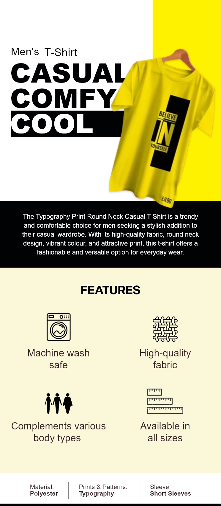 The Typography Print Round Neck Casual T-Shirt is a trendy and comfortable choice for men seeking a stylish addition to their casual wardrobe. With its high-quality fabric, round neck design, vibrant colour, and attractive print, this t-shirt offers a fashionable and versatile option for everyday wear.