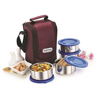 Know MoreNO MICROWAVE? NO PROBLEM! WARMEO is the one stop shop solution. Reheating your food in the microwave destroys its nutritional content. Our range of products is made with the help of cutting edge technology, purest stainless steel material and infusion of polyurethane. So serve at a dinner party in our stylish casserole, eat while traveling in our airtight hot pots or take a lunch break in office in our insulated lunch packs, you can do of all this without using a microwave. Our double wall stainless steel products with high quality insulation ensures that your foods stay hot and fresh for long hours. High Quality Stainless Steel Tiffin made of 201 stainless steel utensil grade material. Stainless Steel material used is non magnetic, non toxic and free of any harmful coating. Special Quality Polyurethane is used for insulation which helps to retain the heat and keep the food fresh for a long time. Mirror Finish Polish gives the tiffins a dazzling silver projection. BPA Free Food Grade Plastic Lid which is airtight and leak proof in nature is used to cover the tiffin bowls. These Lids are made from pure virgin food grade plastic which is unbreakable in nature. Stylish Thermal Insulated Bags are provided to retain the heat and keep food in the tiffins ,steaming hot. A small pocket in provided in the tiffin bag to keep tissues,spoon,fork,etc. Great for Gifting. Brand: Warmeo Material: Stainless steel Colour: Silver Capacity: 1 pc 220 ml capacity Dimensions (mm): L-135 x W-145 x H-230 Weight: 581 gm Includes: 4 pieces WARNING : Do not Keep on fire or Inside the Microwave