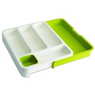 This tray can be used in home to organise messy cutlery drawers with this practical and smart storage solution. The two halves of the tray can be finely adjusted to fit a variety of drawer sizes and lock securely together once in place. .Expandable Tray Plastic Drawer Holder to Store Organize and Includes utensil tray with attachable and expandable cutlery tray; locks into place for functionality. This smart storage solution has four deep-sided compartments that let you separate your knives, forks and spoons, as well as an area for larger utensils or knives plus a handy, moveable dish for small loose items. The Drawer Store fits a wide range of drawer sizes from 11.4-inch up to 18.85-inch. Expandable area for larger items or utensils. It has a moveable storage dish for small, loose items. To use, place utensil tray in right hand corner of your drawer. Then, insert the cutlery tray and push down to lock into place.