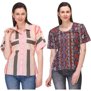 Know MoreYALINA PLUS Combo of a Stripped shirt & a Printed top are basic designs that are simple yet elegant. These hav half sleeves. The striking design of this sensual product does not only elevate your fashion appeal but also compliments your vibrant look at the party. You can team this top with Jeans of your choice to look fashionable flaunt and a no-fuss look wearing this top. It is made form 100% premium cotton fabric. These are available in four sizes. DO NOT BLEACH & DO NOT WASH WITH DARK COLOR CLOTHES, WASH SEPARATELY.