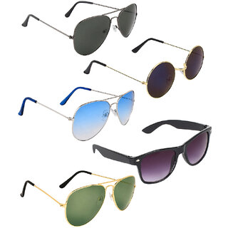 This is combo pack of 5 Sunglasses. It have 3 Aviator Sunglasses , 1 Round Sunglasses and 1 wayfarer sunglasses.